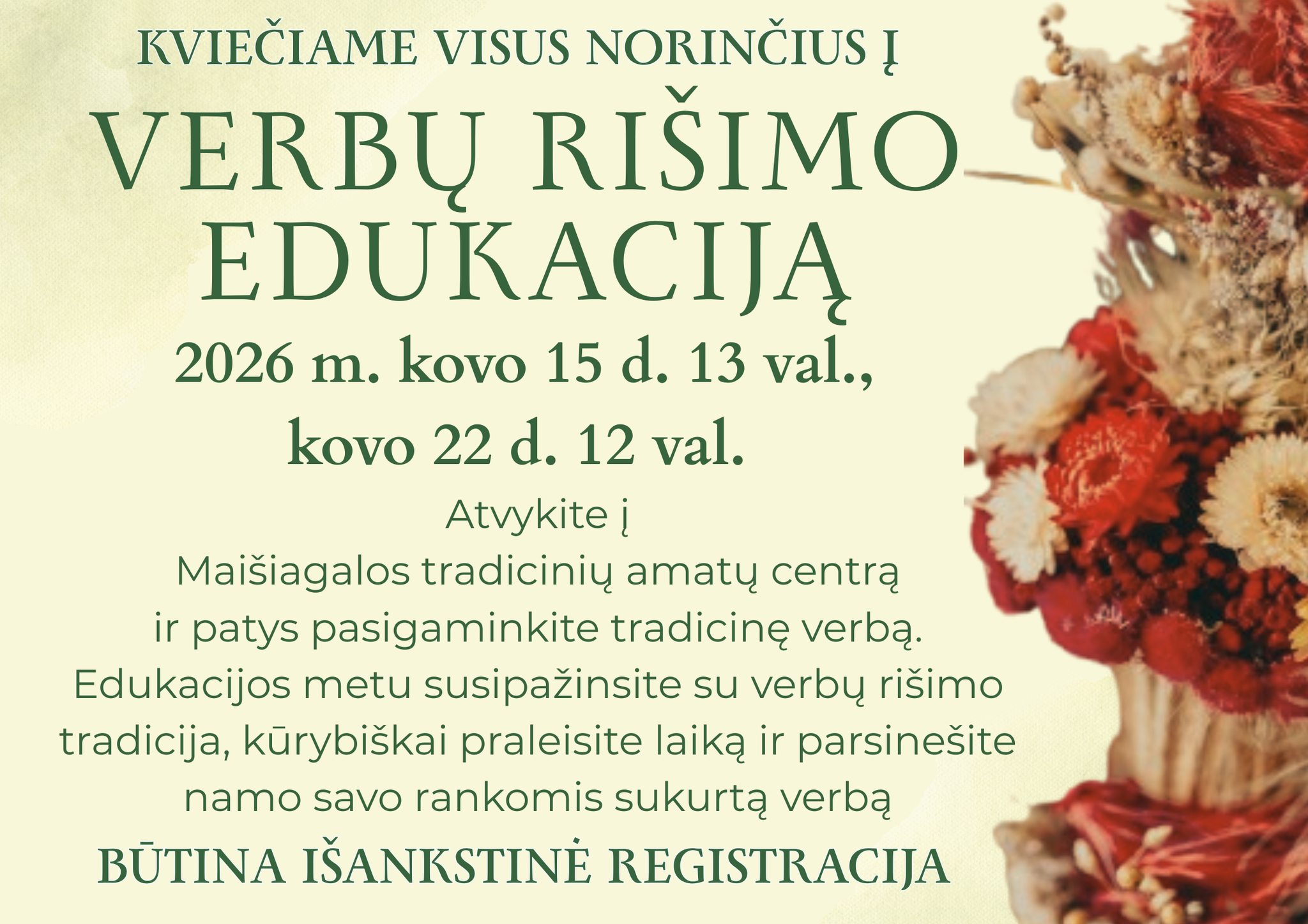 Kviečiame į verbų rišimo edukaciją, kurios metu susipažinsite su šia sena ir gražia tradicija. Amatininkas papasakos apie verbų simboliką ir rišimo būdus, o edukacijos metu kiekvienas dalyvis savo rankomis susiriš verbą.